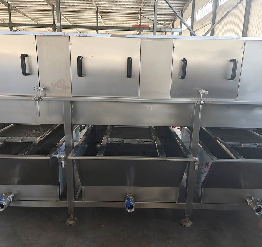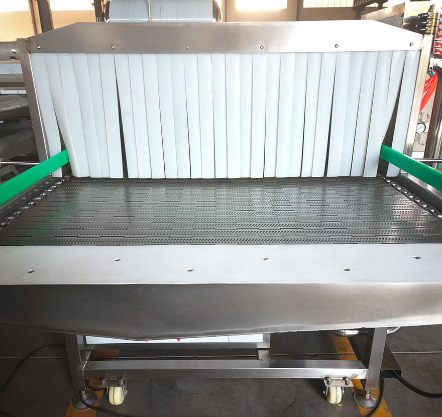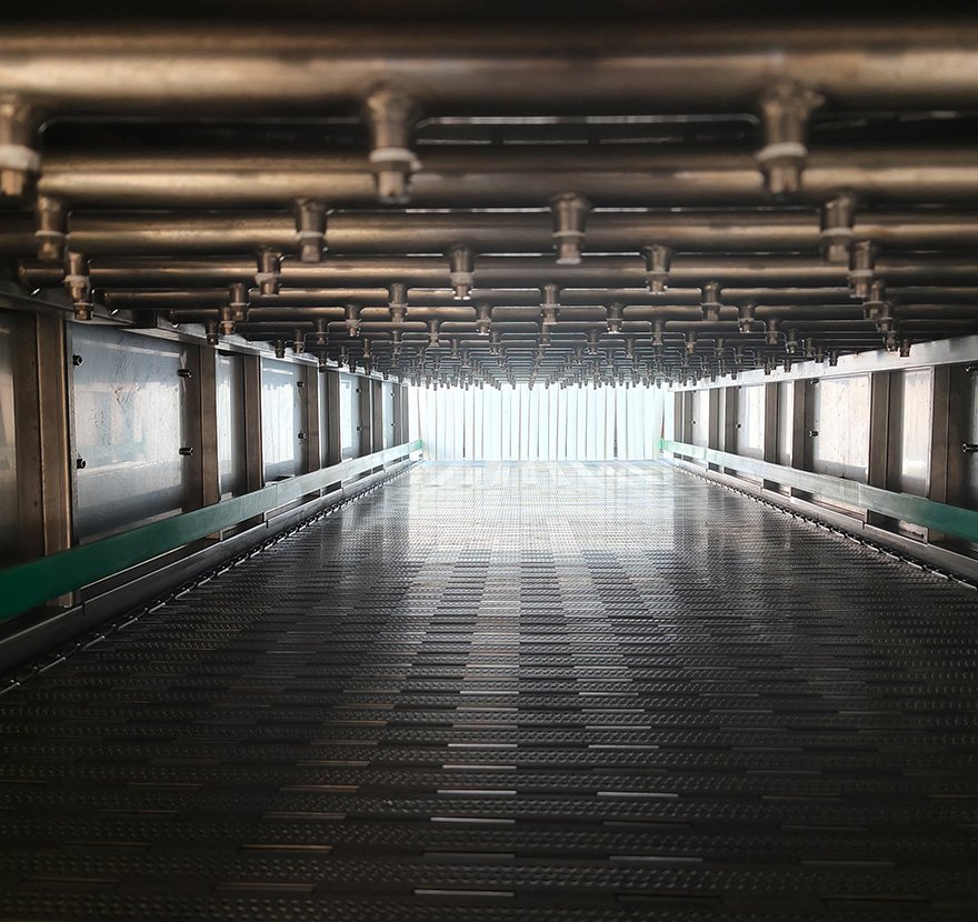 Лента конвейера изготовлена из высокопрочной нержавеющей стали, что обеспечивает плавность хода и высокую грузоподъёмность. В приводной системе используется частотно-регулируемый электродвигатель, позволяющий гибко и точно контролировать время стерилизации (обычно с шагом в десятки минут) в зависимости от типа продукта и требований технологического процесса. По обеим сторонам ленты установлены ограждения для обеспечения стабильной и упорядоченной транспортировки продукта.