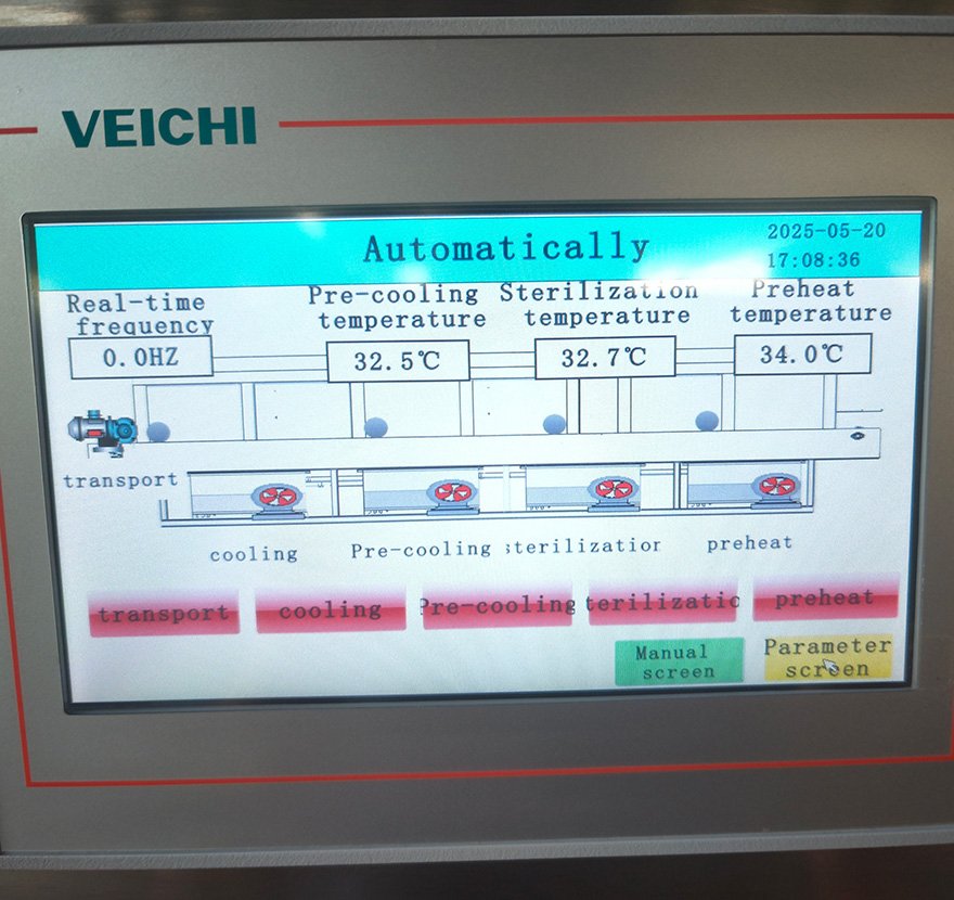 Оборудование разделено на несколько независимых температурных зон, включая зоны предварительного нагрева, стерилизации и охлаждения. Каждая зона оснащена независимой интеллектуальной системой контроля температуры и блоком нагрева/охлаждения для точной установки и поддержания заданной температуры. Ступенчатое изменение температуры эффективно уничтожает микроорганизмы, предотвращая резкие перепады температуры, которые могут привести к разрыву стеклянных бутылок или деформации упаковки.