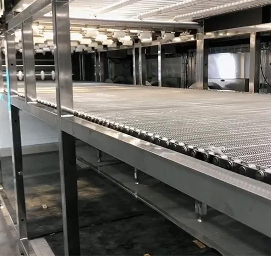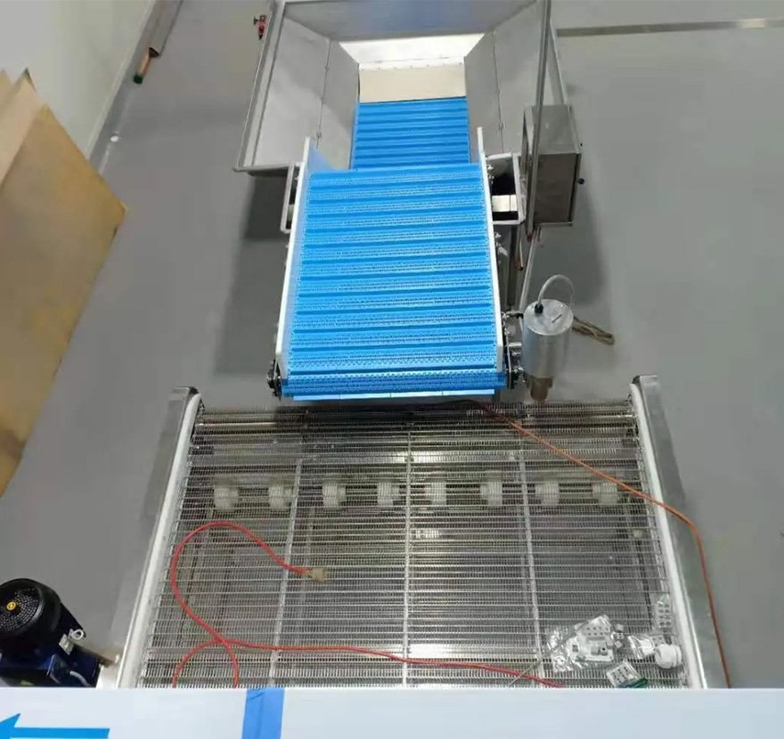 11. Передняя и задняя секции сетчатого конвейера оснащены вибрационными роликами переменной частоты, предотвращающими прилипание продукта. Сетчатый конвейер также обеспечивает отличную вентиляцию, предотвращая прилипание замороженных продуктов.