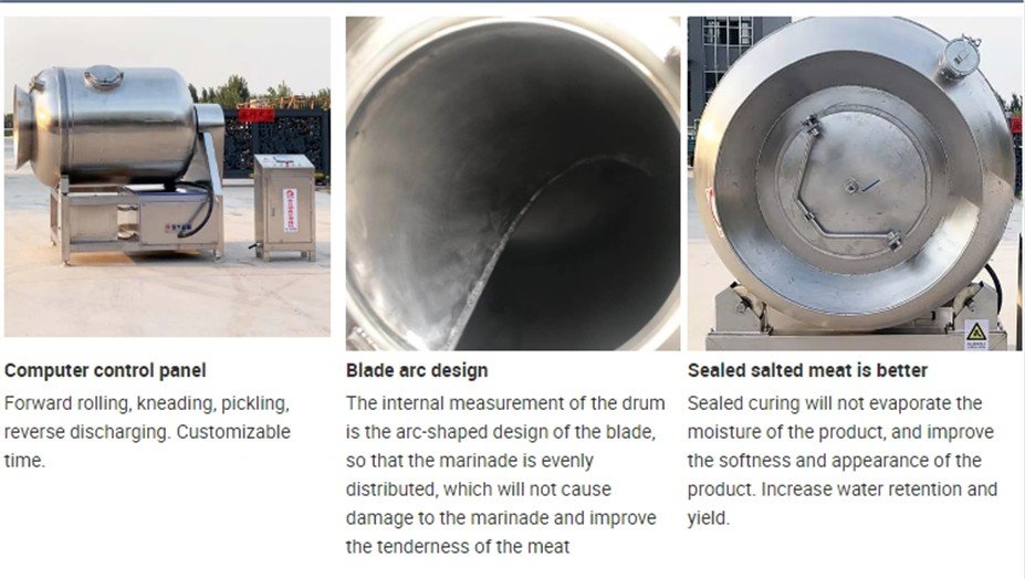 Вальцовочно-месильное оборудование использует принцип физического воздействия, заставляя мясо в барабане подниматься и опускаться, ударяться друг о друга, обеспечивая массаж и маринование. Вальцовочно-месильное оборудование обеспечивает равномерное впитывание маринада, улучшает его связывающие свойства и эластичность, а также улучшает вкусовые качества и качество нарезки продукта. Оно способствует удержанию влаги и повышению выхода готового продукта. Оно улучшает внутреннюю структуру продукта, экономит энергию и повышает эффективность.