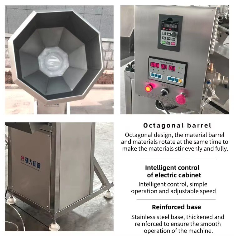 Преимуществами оборудования являются простая и практичная конструкция, прочная сварка и блестящая поверхность. Корпус барабана выполнен из нержавеющей стали восьмиугольной формы, что позволяет равномерно перемешивать продукты за короткое время.