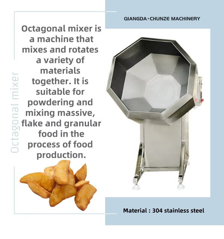 Восьмиугольный миксер – это машина для смешивания и вращения различных материалов. Он подходит для измельчения, приправления, подачи, смешивания и навешивания блочных, листовых и гранулированных пищевых продуктов, а также для упаковки сырья в порошок в процессе производства и переработки пищевых продуктов.